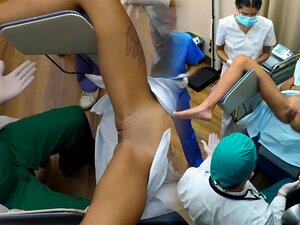 Paciente morena europeia examinada por médico em hospital falso, depois ela fez boquete nele e levou uma trepada na buceta na mesa de exame e na poltrona